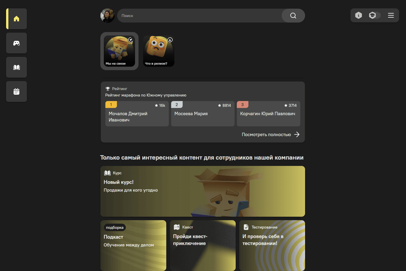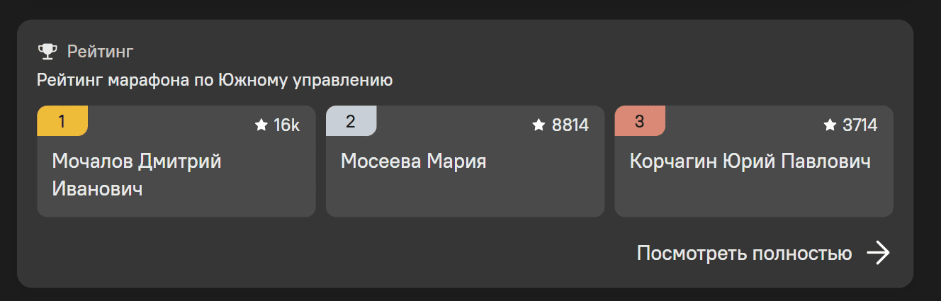 Эти рейтинги не только доступны в разделе с общим рейтингом по платформе: теперь их можно вывести на главную страницу, чтобы все видели успехи участников геймификации.