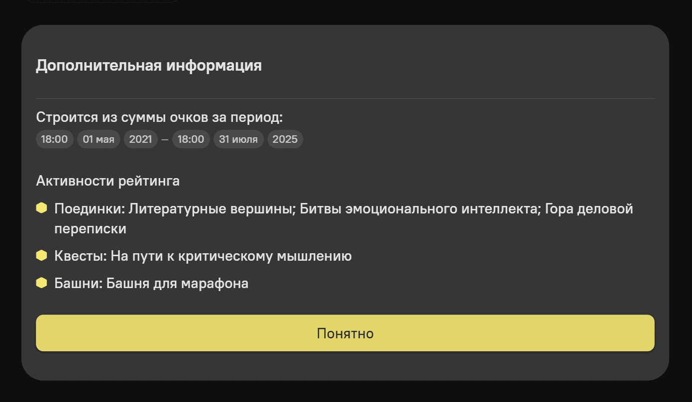 К общему рейтингу по платформе и рейтингам по конкретной активности теперь вы сами можете добавлять другие рейтинги, настроенные под ваши цели. Например, за определённый промежуток времени у нескольких конкретных групп и только по очкам, заработанным в конкретном поединке, квесте и, например, турнире. В такой рейтинг войдёт сумма очков из указанных активностей и заработанных за определённый период.