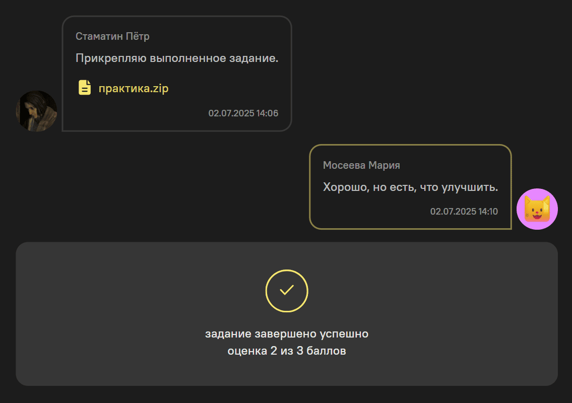 Когда наставник (или руководитель) проверяет открытое задание из трека, он может оценить его по шкале, которую указал администратор. Если администратор не настроил оценку по шкале, то сохраняется система с двумя вариантами оценки «выполнено» и «требует доработки».