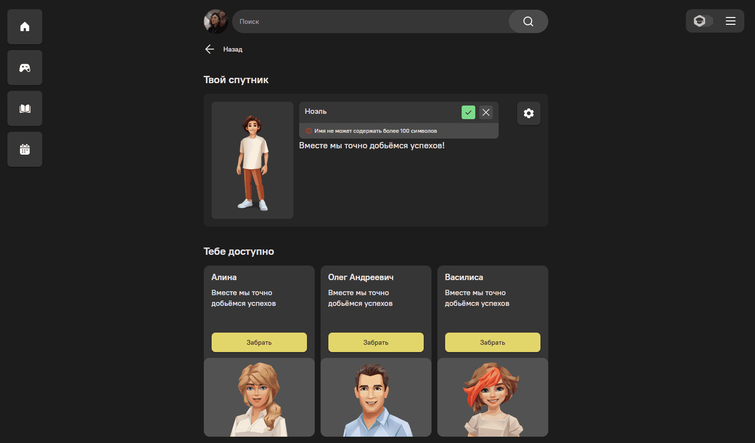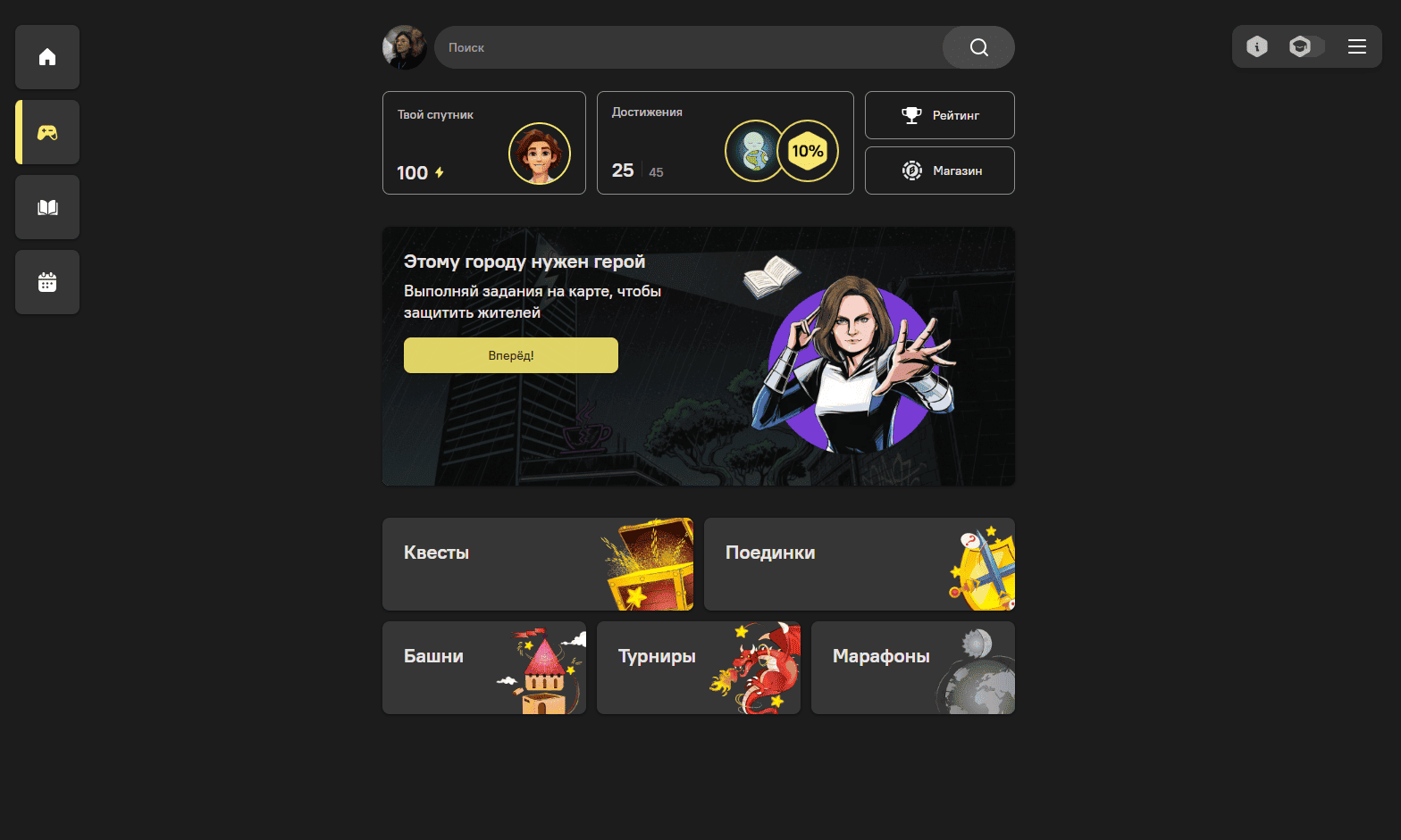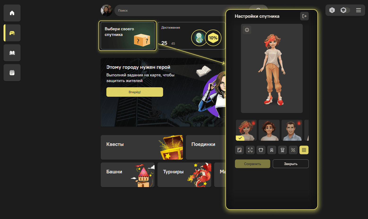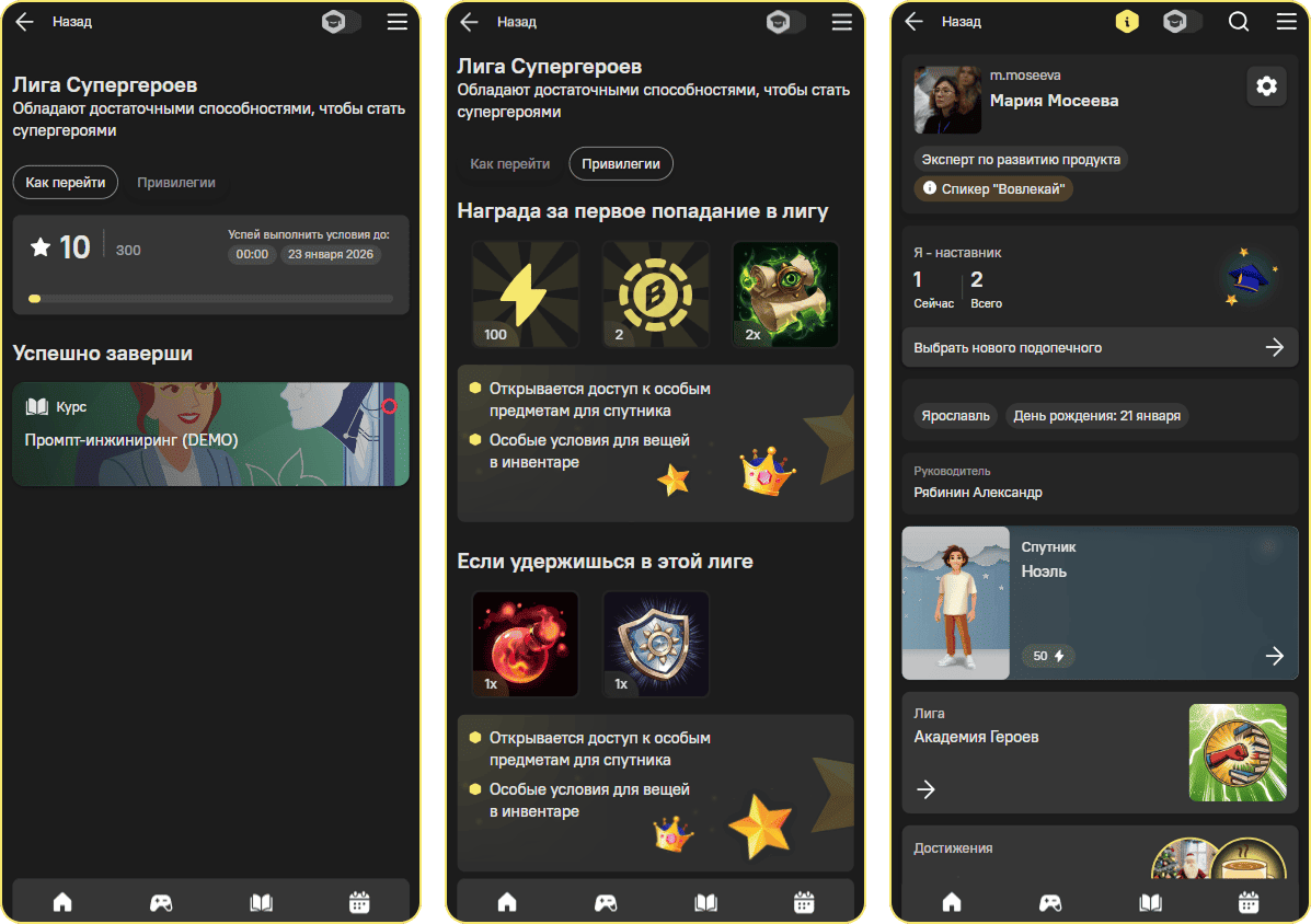 Чтобы вместить всю новую информацию и сделать это удобно, мы изменили интерфейс профиля и игрового раздела. Если для вашей компании не настроены персонажи-спутники и система лиг, то в интерфейсе пользователя они тоже отображаться не будут.