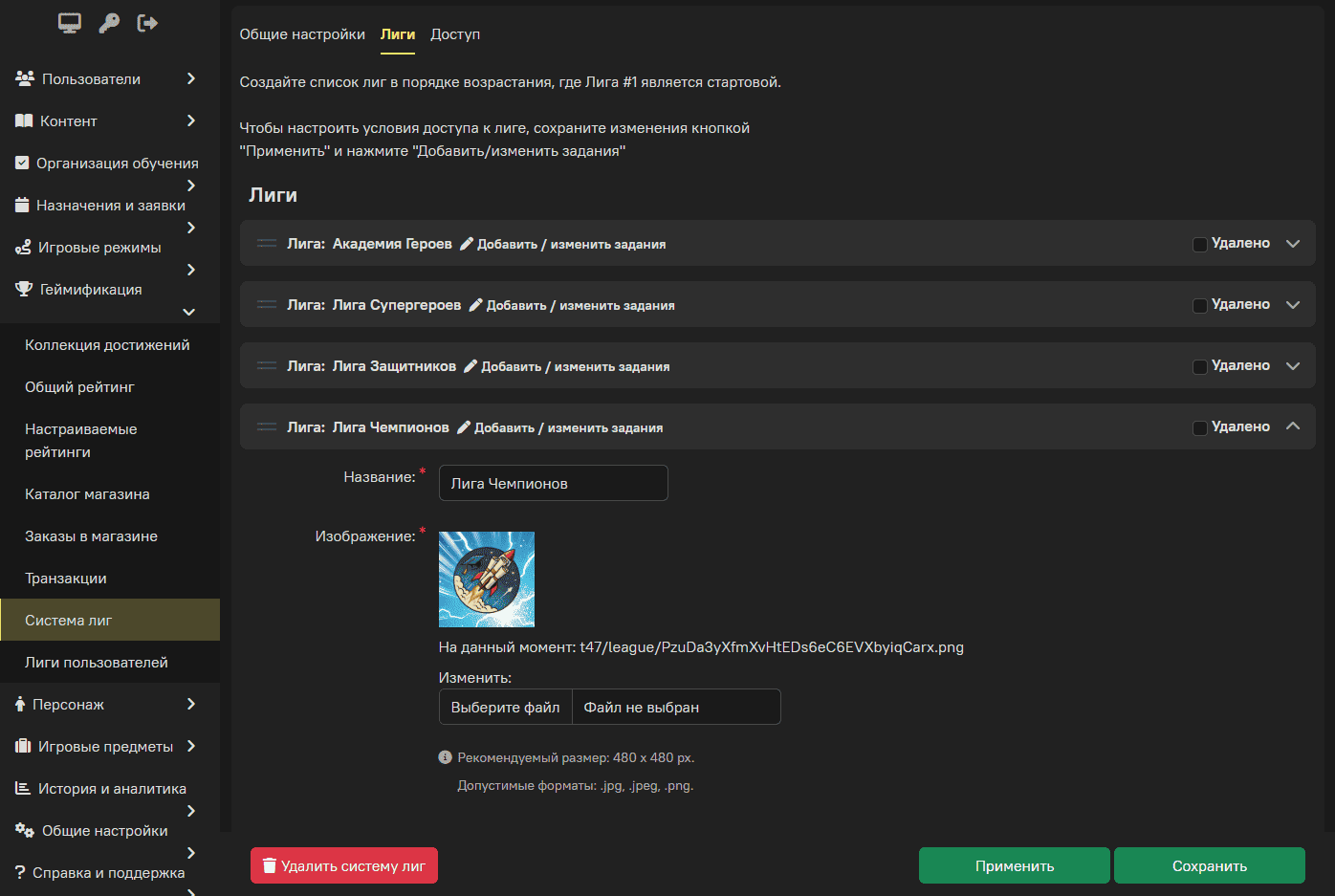 Запустите систему мотивации: соревнование в лигах. Придумайте названия, загрузите уникальный визуал и, что самое главное, настройте свои условия перехода к следующей лиге и сохранения места в ней.