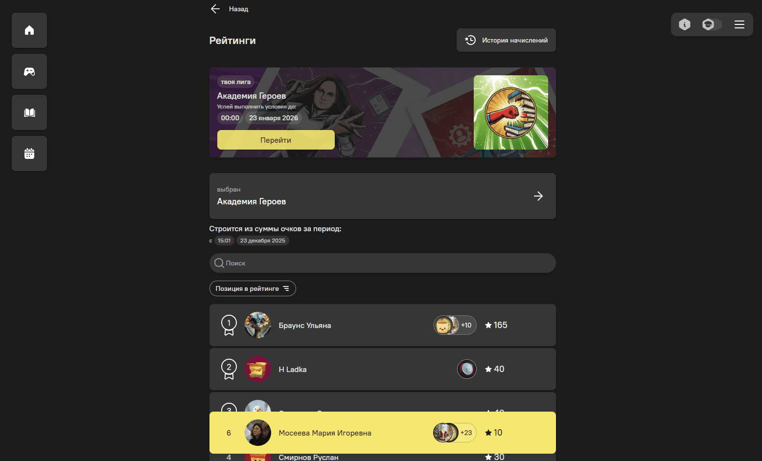 В ваших руках установить период, когда автоматически проверяется выполнение пользователями условий перехода и сохранения места в лиге: например, месяц. Если за месяц пользователь не выполнит условий, он не просто не поднимется выше, он ещё и опустится на лигу ниже. И, конечно, для каждого периода, в каждой лиге свой отдельный рейтинг.