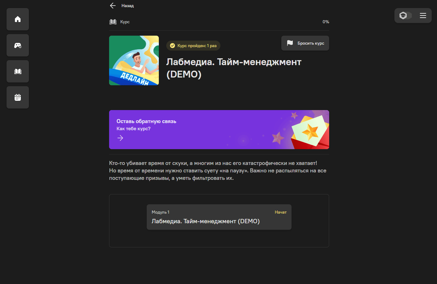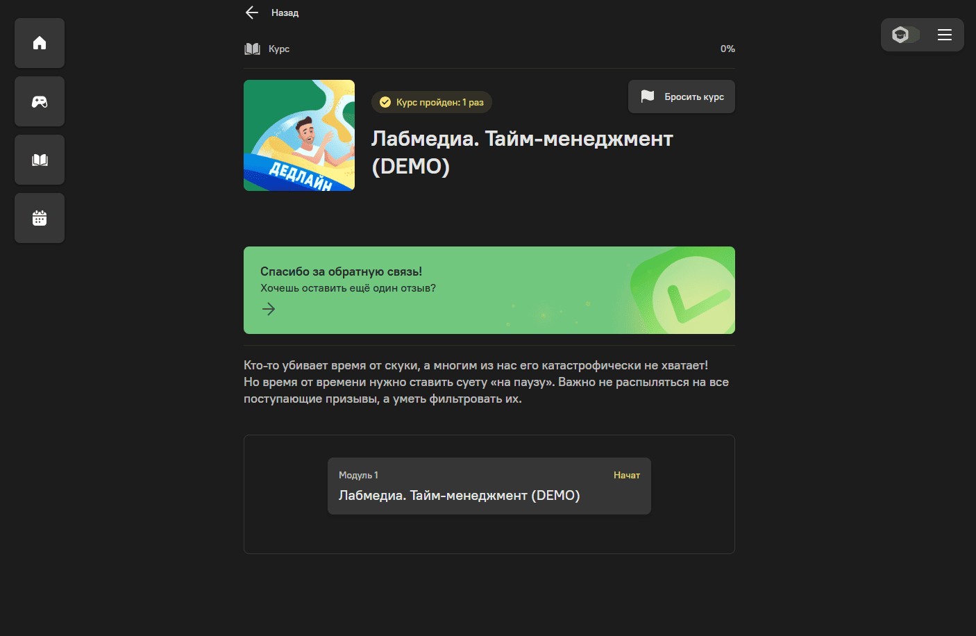 Энергия нужна, чтобы ограничить доступ к обучению внутри карт за день. Было ли у вас такое: обучение запланировано на неделю, а сотрудники проходят всё за день, перегружаются информацией, усваивают всё поверхностно, лишь бы быстрее закончить. Система энергии поможет контролировать это ненавязчиво — в игровом формате. Чтобы включить систему энергии для вашей компании — напишите нам на почту: support@labmedia.su