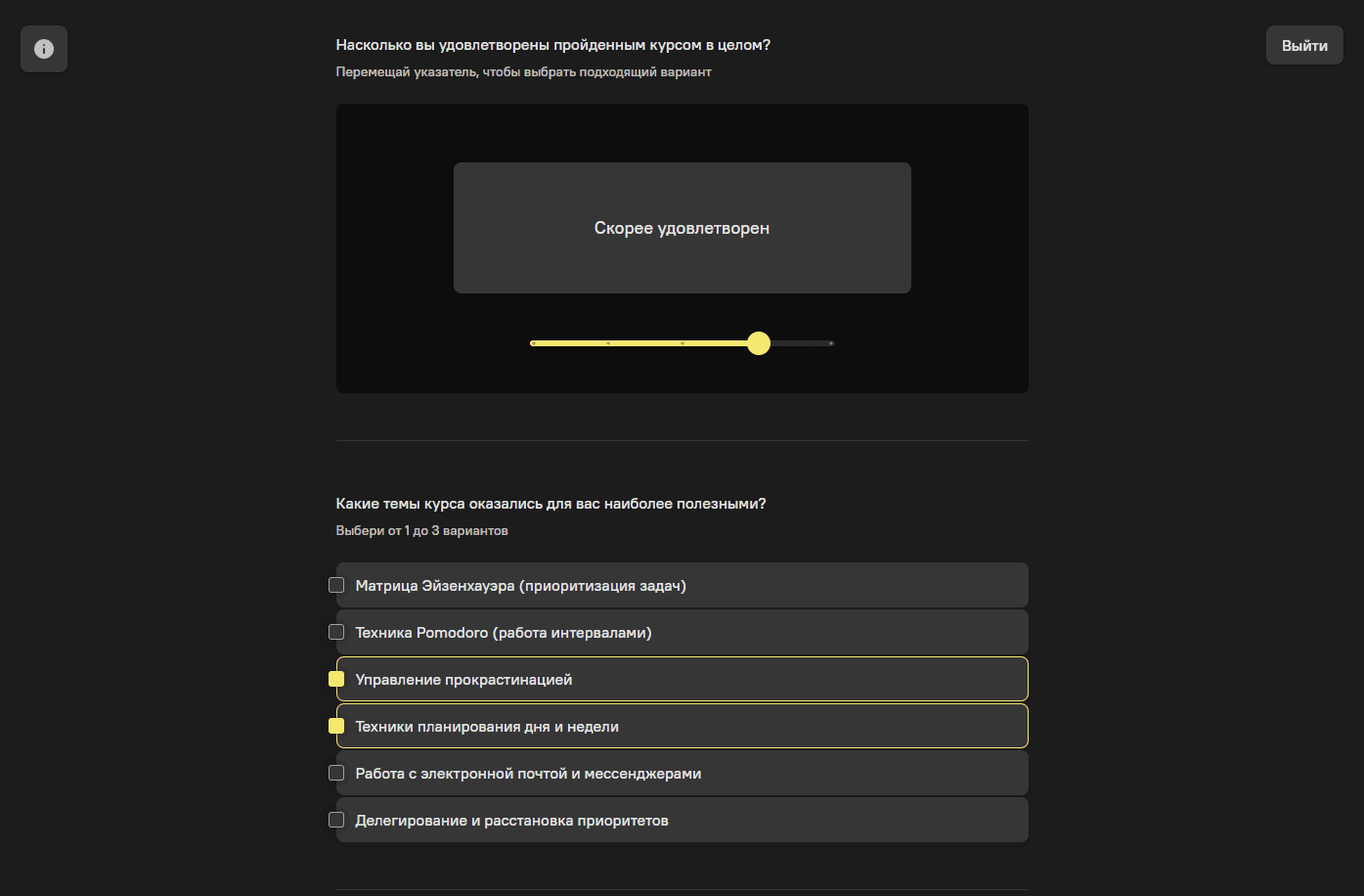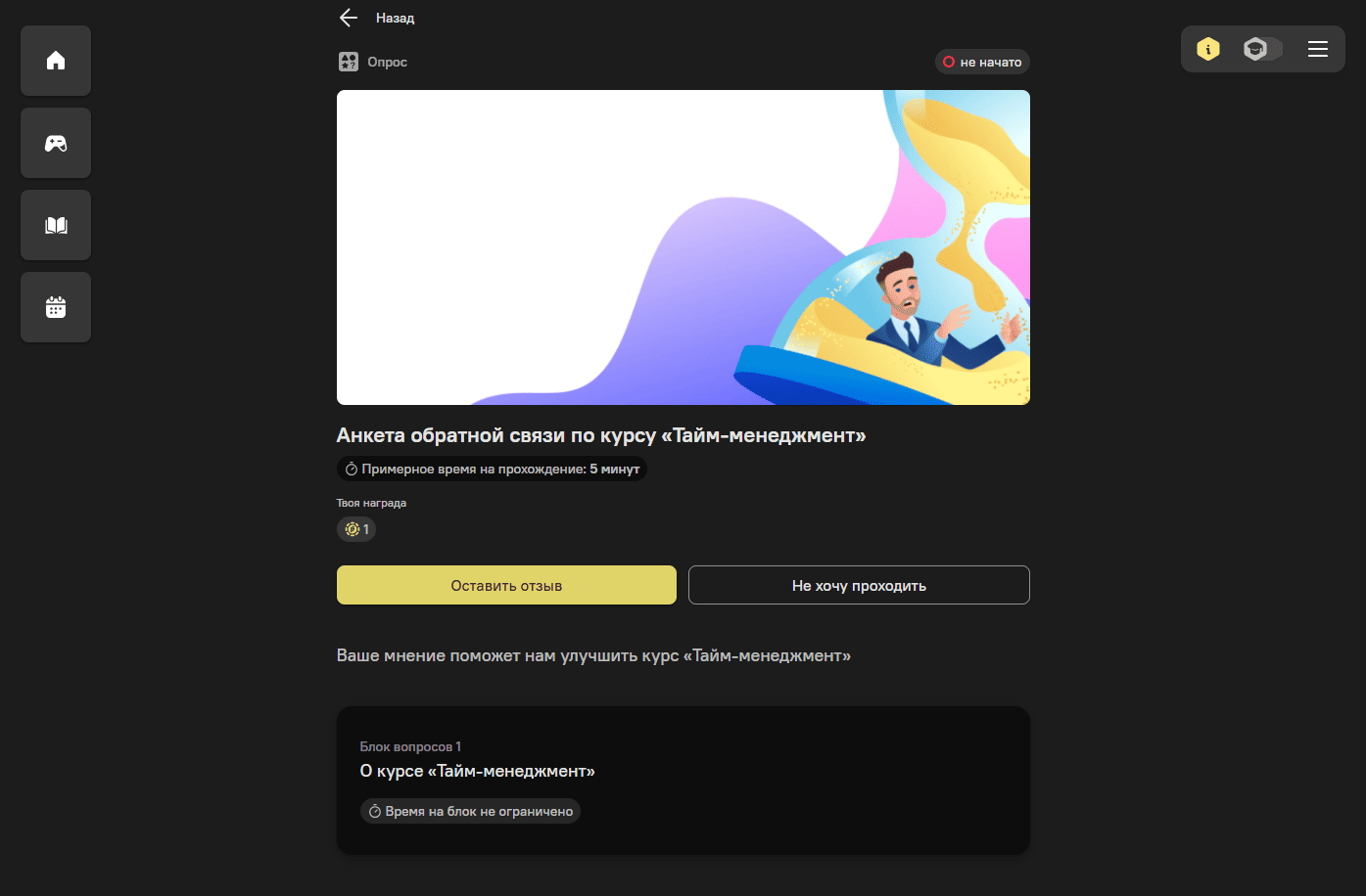 Но очень часто после курса или мероприятия нам как организаторам обучения важно задать пользователям конкретные вопросы. И точно больше одного! Теперь это возможно с помощью упрощённого опроса — «анкеты отзыва», который создаётся по принципу опроса, но может быть прикреплён в карточку курса или мероприятия. Заполнить анкету будет предложено всем, кто пройдёт курс или посетит мероприятие.