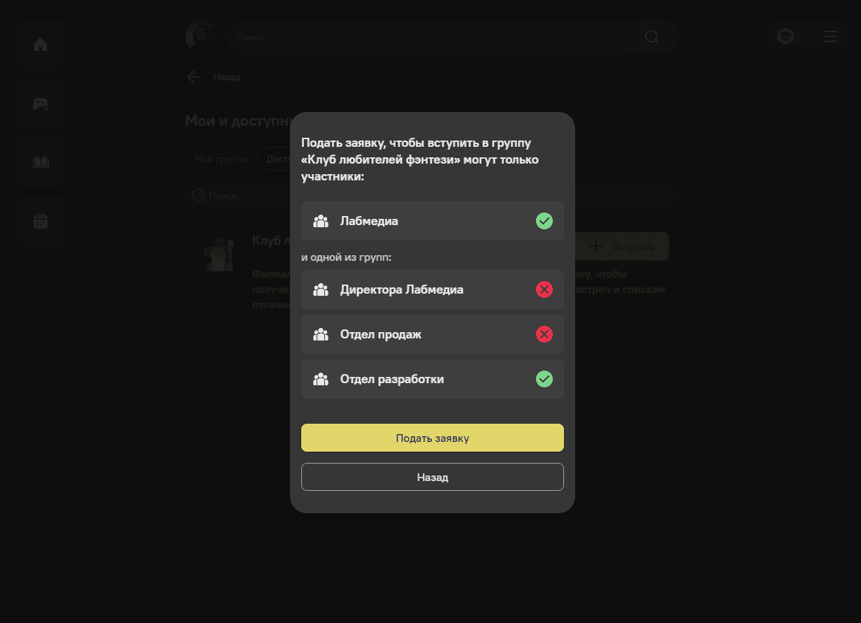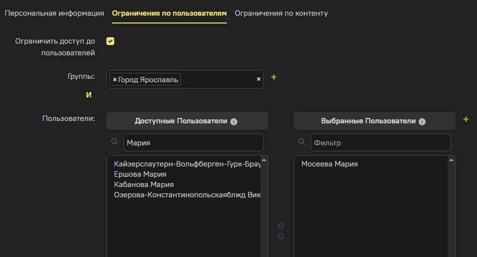 Для всех форматов, кроме «Преднастройки», можно указать ещё и дополнительные условия. Например, в каких ещё группах должен состоять пользователь, должен ли он быть хотя бы в одной из них или во всех сразу.