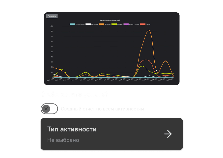 Планируйте обучение, назначайте треки и курсы, собирайте учебные материалы в базе знаний, отслеживайте успешность прохождения тестов и аттестаций. Вовлекай поможет выстроить непрерывное обучение в компании.