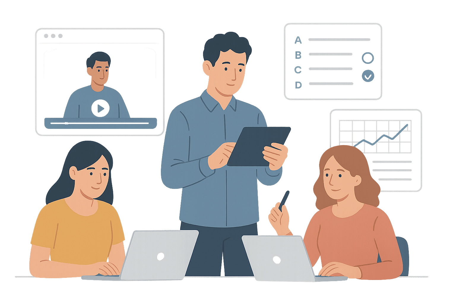 Запускайте обучение новым продуктам и регламентам во всех подразделениях и филиалах одновременно. Поддерживайте актуальность знаний и качество работы.